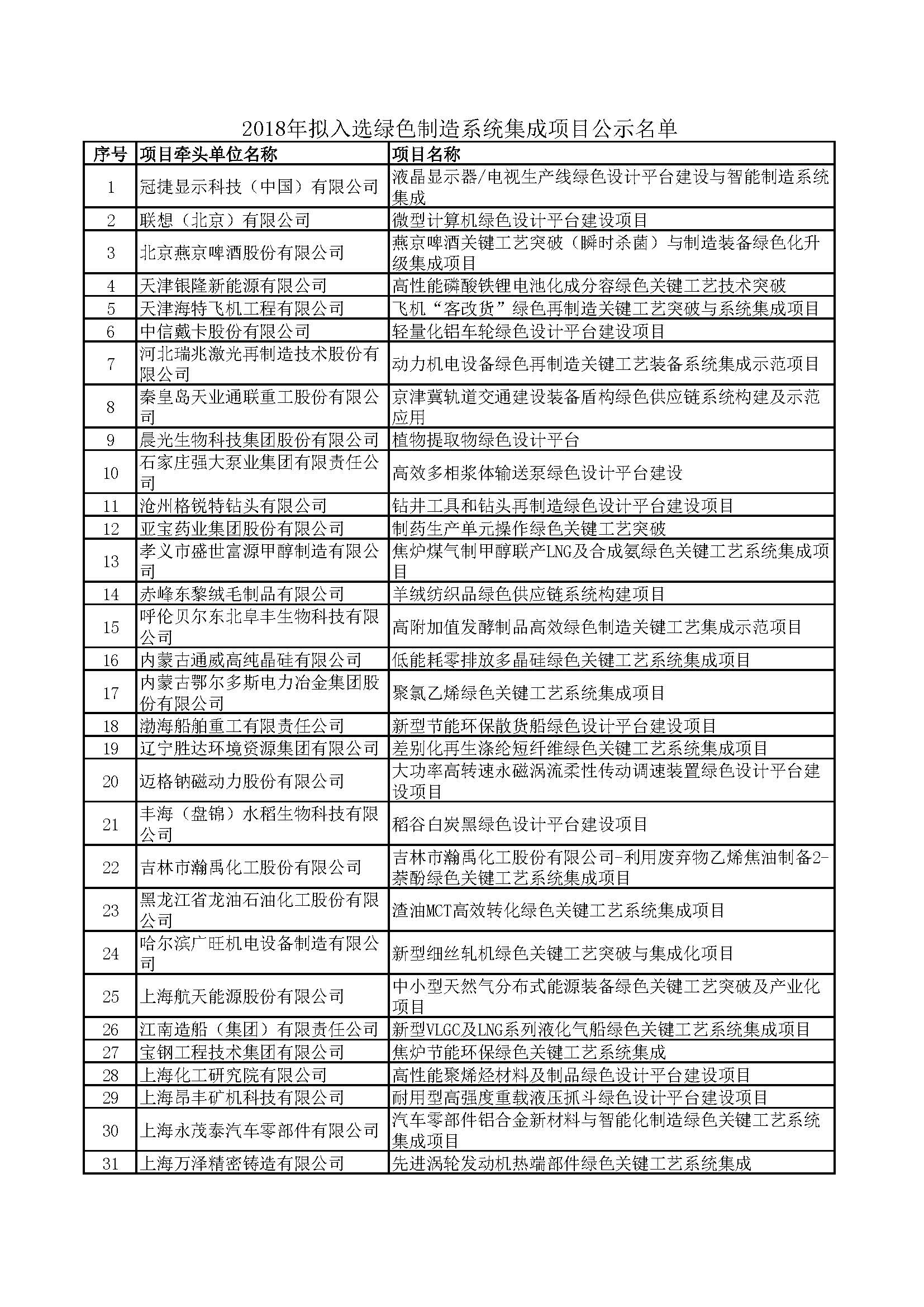 附件:2018年擬入選綠色制造系統(tǒng)集成項目公示名單