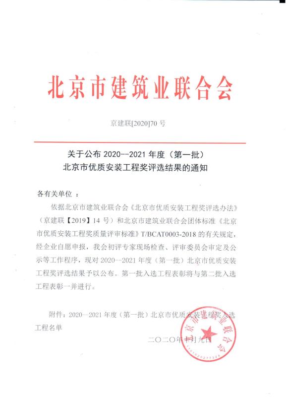熱烈慶祝我公司入圍2020-2021年度北京市優(yōu)質(zhì)安裝工程獎入選名單